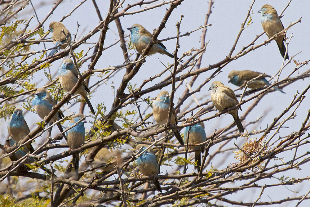 The blue waxbill (Uraeginthus angolensis) occurs in southern Africa from Cabinda and the Congo to Kenya and Tanzania in the east south to northern South Africa. The blue waxbill occurs in a variety of habitats but generally prefers well-watered and semi-arid savanna, particularly where umbrella thorns Vachellia tortilis grow, also occupying natural growth in cultivated land, mopane Colosphermum mopane and forest edges.The blue waxbill mainly eats grass seeds which are taken from the inflorescences, this is supplemented with termites and other insects. They have also been recorded eating the fallen fruits of Boscia albitrunca.[7] It is normally seen in pairs or family parties but it does form larger flocks which often mix in with flocks of other estrildids.[5] In the blue waxbill both sexes build the nest, which normally placed among the foliage of a bush or tree, especially umbrella thorn and sickle bush Dichrostachys cinerea. They often choose to build the nest near a wasps' nests such as Belonogaster juncea, there is no evidence that wasps deter nest predators, but the birds may use the presence wasp nests as a way of working out whether there are arboreal ants Psuedomyrmex spp in the tree, as if present they would deter nesting by any wasps or birds. Blue waxbills may also re-use the old nests of other birds. They breed all year round but egg laying usually peaks in January, tow months on from the onset of the rains in southern Africa. The clutch size is between 2-7, incubation is carried out by both sexes and takes 11–12 days. Both parents feed the chicks on green grass seeds and termites, until they fledge after 17–21 days. They are capable of fending for themselves a week after fledging, becoming fully independent a week later. https://en.wikipedia.org/wiki/Blue_waxbill